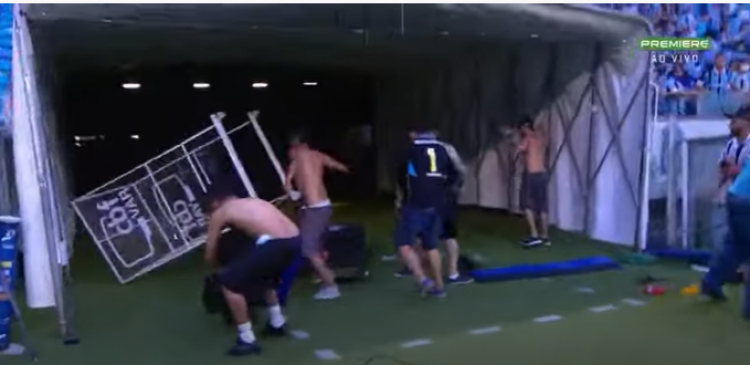 نشر على مواقع التواصل الاجتماعي، اليوم الثلاثاء، مقاطع فيديو تظهر لحظة اقتحام مشجعي فريق غريميو، أرض الملعب، بعد خسارة فريقه امام نظيره بالميراس بالدوري البرازيلي بنتيجة ثلاثة أهداف لهد.