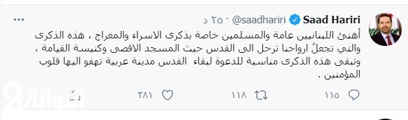 وأضاف الحريري في تغريدة على حسابه الرسمي بتوتير، أن "ذكرى الإسراء والمعراج تجعلُ أرواحنا ترحل إلى القدس حيث المسجد الاقصى وكنيسة القيامة، وتبقى هذه الذكرى مناسبة للدعوة لبقاء القدس مدينة عربية تهفو اليها قلوب المؤمنين".