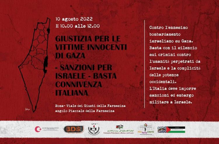 العدالة لضحايا غزة الابرياء، ومطالبة ايطاليا بفرض العقوبات وانهاء التواطؤ الايطالي مع اسرائيل.