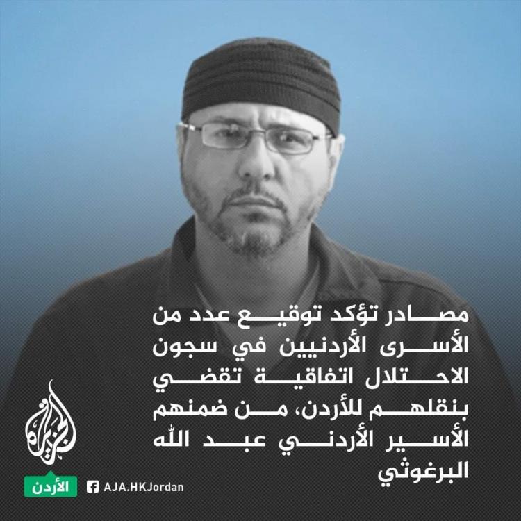 ونقلت قناة الجزيرة القطرية عن مقرر اللجنة الوطنية للأسرى والمفقودين الأردنيين، فادي فرح، تاكيده على توقيع عدد من الأسرى الأردنيين في سجون الاحتلال اتفاقية تقضي بنقلهم إلى الأردن لاستكمال بقية مدة محكومياتهم.
