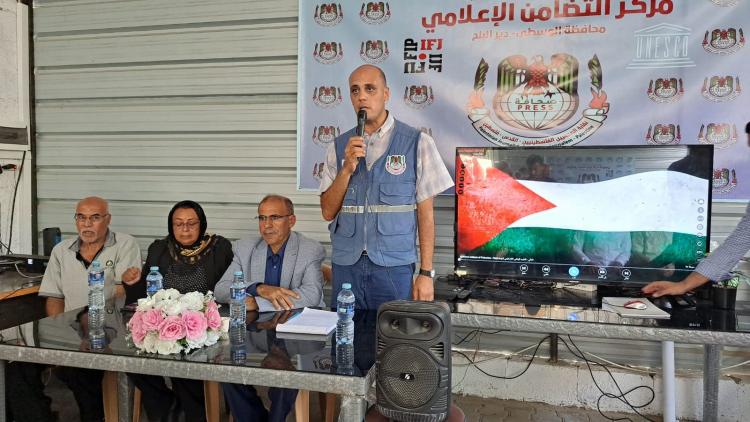 من جانبه اعتبر نقيب الصحفيين الفلسطينيين ناصر أبو بكر، في كلمة مسجلة له، إنشاء هذا المركز في دير البلح خطوة ثانية في خطة إنشاء المراكز الإعلامية في قطاع غزة، موضحا أن النقابة بالتعاون مع منظمة اليونسكو والاتحاد الدولي للصحفيين بذلت جهدا كبيرا وستواصل جهدها مع المؤسسات الداعمة من أجل خدمة الصحفيين في قطاع غزة، وتوفير البيئة المناسبة لهم للقيام بعملهم الصحفي على أكمل وجه وبكل مهنية.