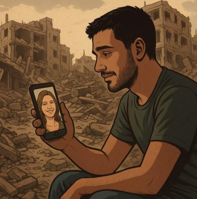 يجلس (إبراهيم. ف) أمام ركام منزله المدمر في حي الدرج وسط مدينة غزة، يحدّق في شاشة هاتفه التي تجمعه بصور امرأة غريبة الوجه واللغة. على الطرف الآخر، تظهر "نوا" الأميركية، التي تعرَّف إليها قبل أشهر عبر "فيسبوك" تبتسم له، بينما هو يحاول إخفاء وجعه بابتسامة مصطنعة، كأن الاتصال بينهما نافذة صغيرة يتسلل منها الأمل من بين الركام.