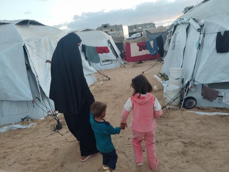 في خيمة أخرى، تعيش ( أ. د.) 24 عامًا، نازحة من حي الصبرة جنوب مدينة غزة، أم لطفلين يبلغان أربع سنوات وعامين، فقدت زوجها في نوفمبر 2023.